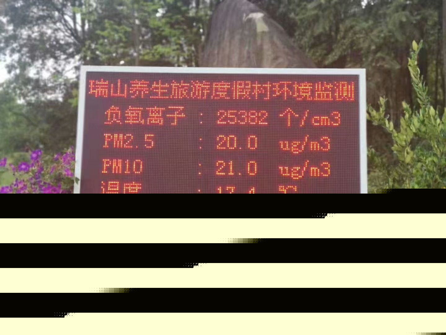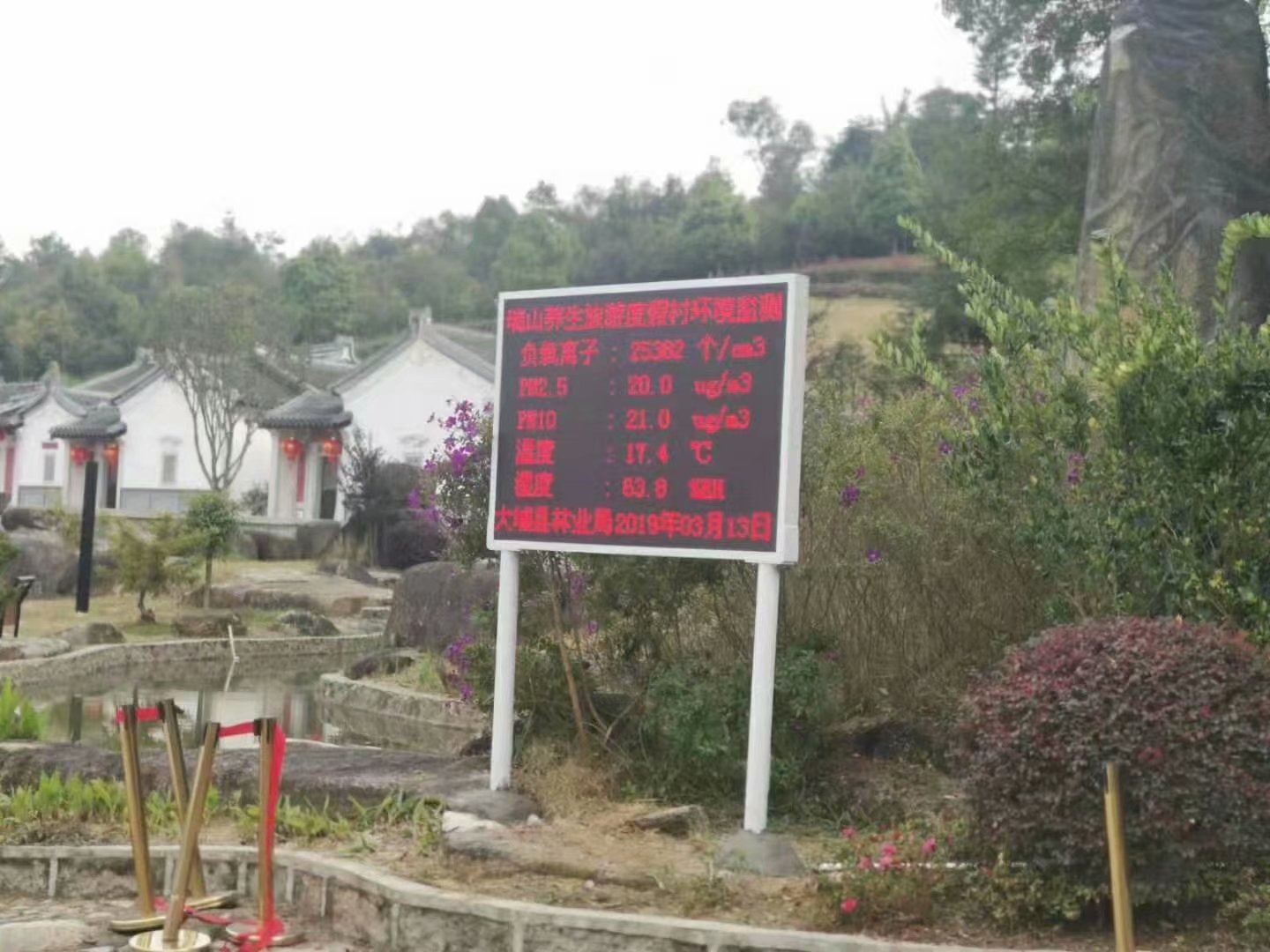 瑞山養生旅游度假村 項目地址:梅州大埔縣 配置:負氧離子 PM2.5 PM10 溫度 濕度 ,遠距離無線傳輸,景區現場LED大屏幕顯示實時監測數據