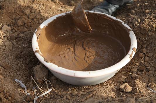 4.準備好泥漿,泥漿不能太稀也不能太稠,將泥漿倒入孔洞中,大約到孔洞的一半。