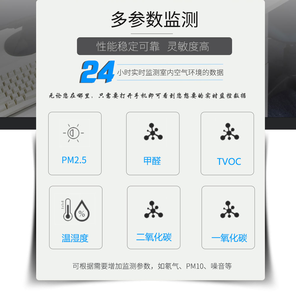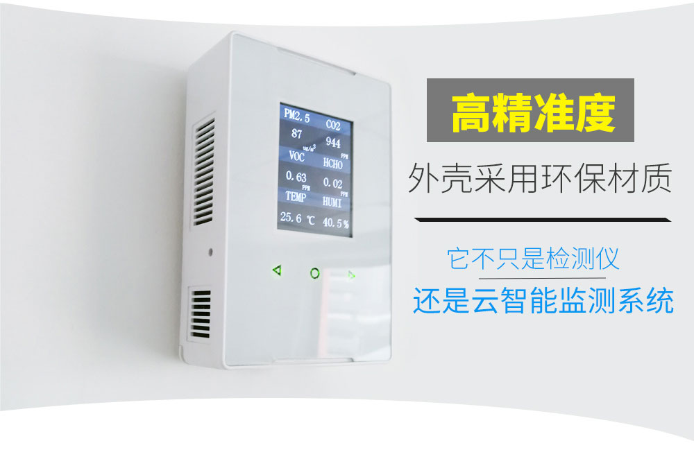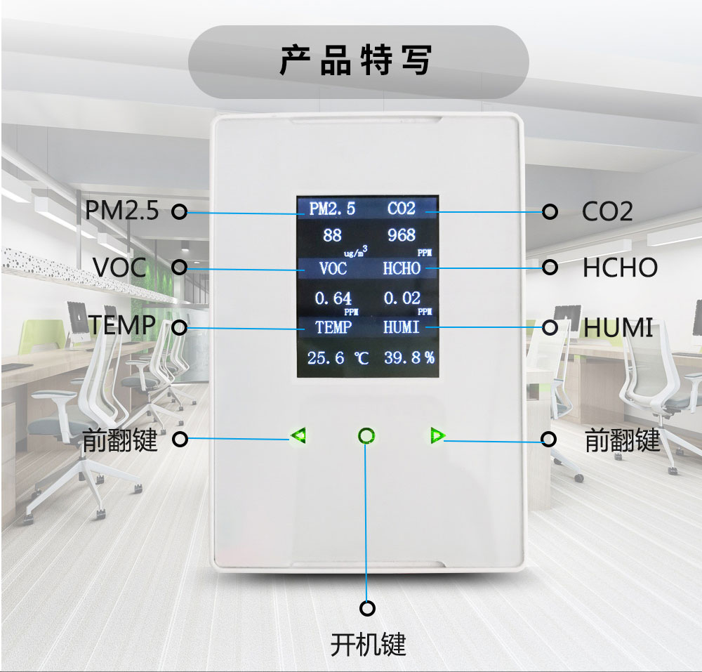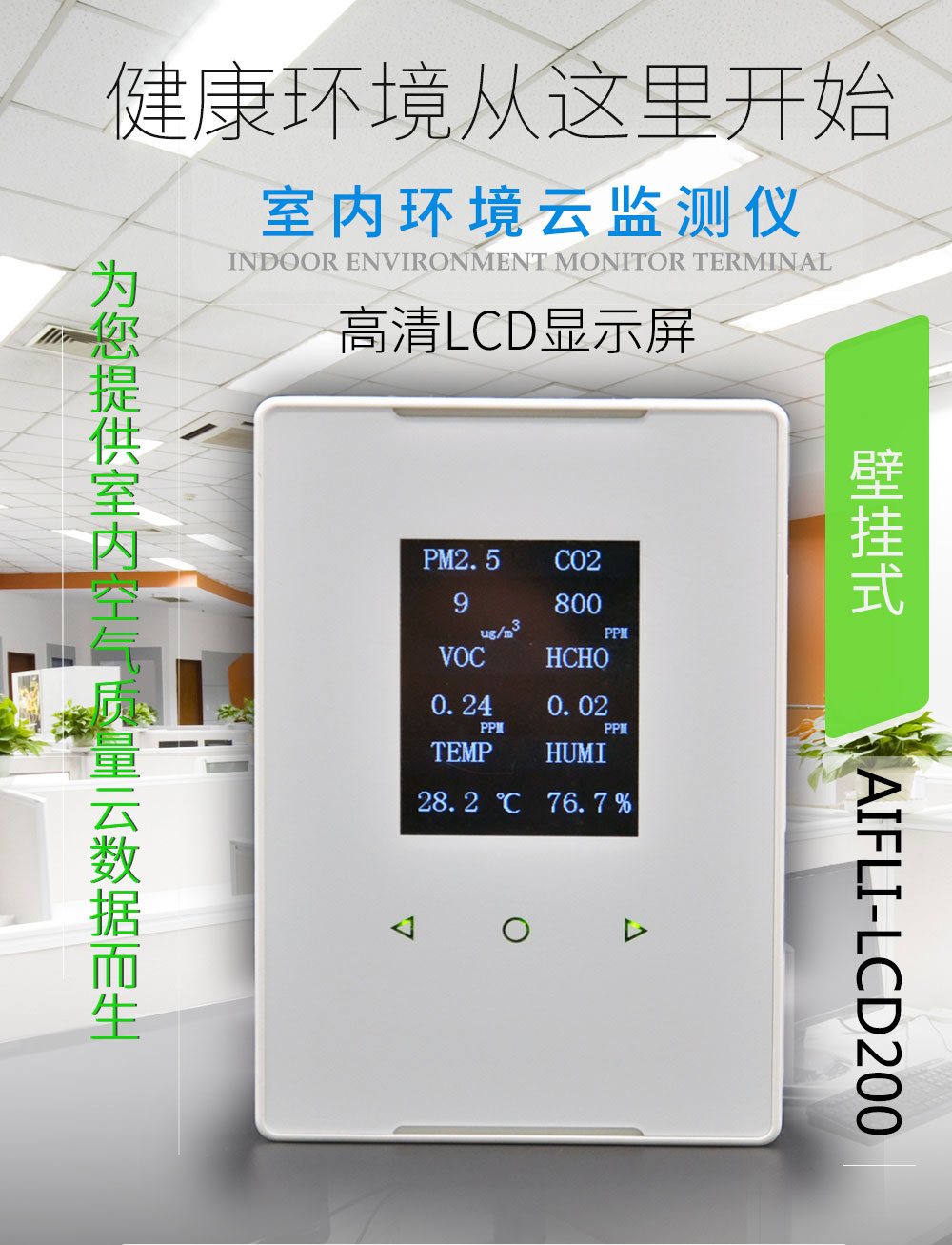 AIFLI-LCD200室內專用環境檢 監測系統終端-壁掛式是一款專門針對家居及公共場所室內環境而定制全面24小時實時在線監測的系統終端設備,可以在手機端、電腦端遠程查看相關監測數據。