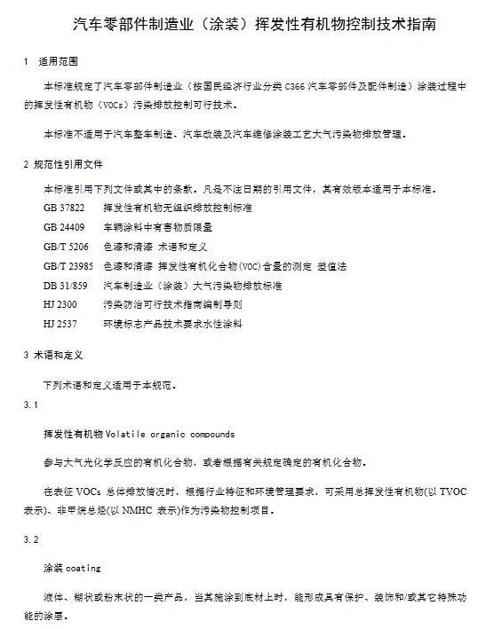 本標準規定了汽車零部件制造業(涂裝)揮發性有機物污染防治可行技術。 本規范按照GB/T 1.1-2009給出的規則起草。